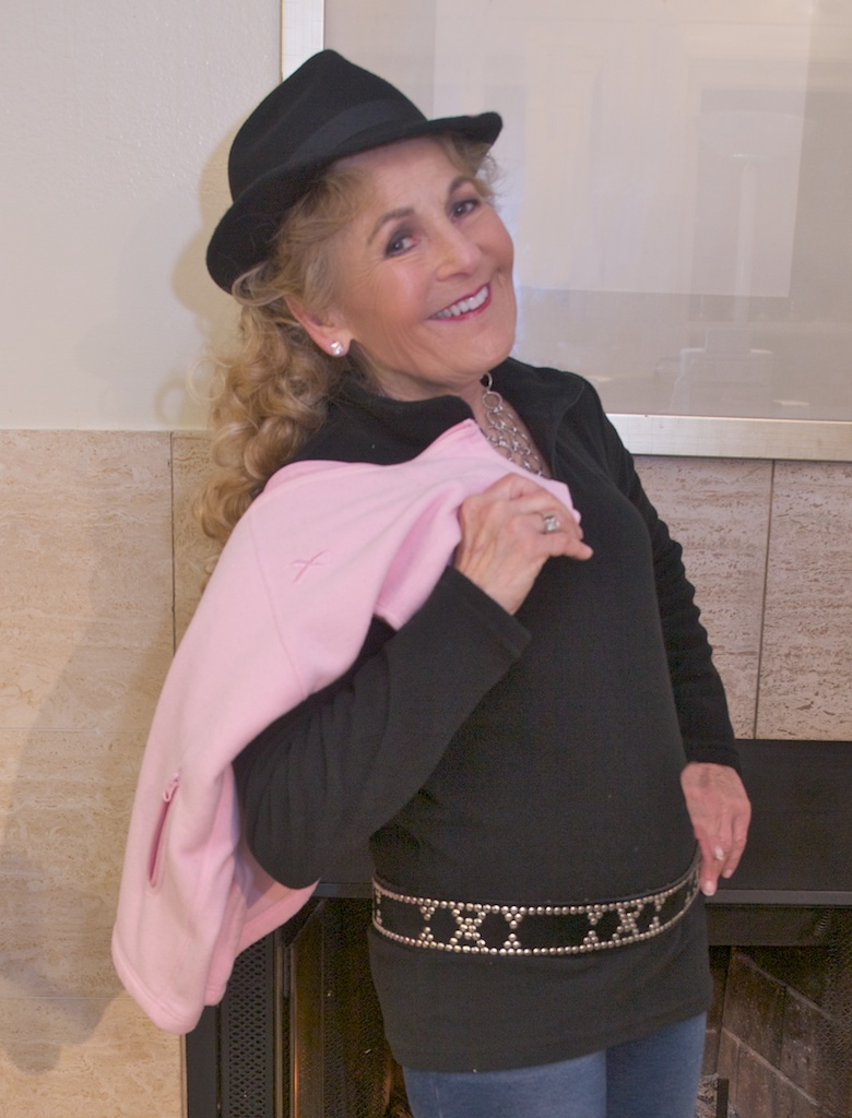 Pink ribbon vest: Breast Cancer Site. Silver circles necklace: El Cerrito Plaza Jewelers. Black, Champion, fleece shirt: Target girls. Hue washed, blue jeggings. Silver studded belt: thrifted. Black buckel boots and black fedora hat: Target.