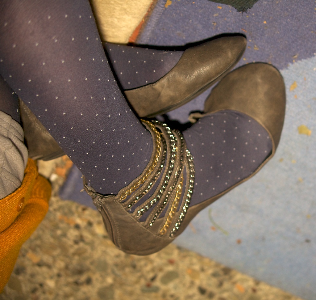 The Rock Solid sparkly shirt delighted two little girls today; I was the third! It's a gift from cousins Kathy and Danielle. Below is the fleur de lys detail on the shirt. Jeggings: Anthropology. Boots and hat: Target. Filigree pin: inherited from Mother.