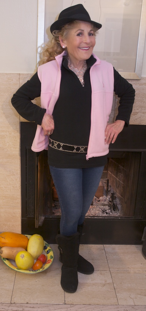 Pink ribbon vest: Breast Cancer Site. Silver circles necklace: El Cerrito Plaza Jewelers. Black, Champion, fleece shirt: Target girls. Hue washed, blue jeggings. Silver studded belt: thrifted. Black buckel boots and black fedora hat: Target.