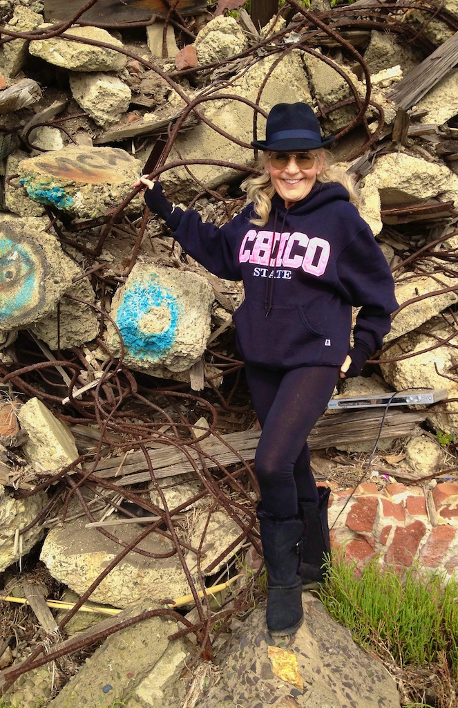 Black sweatshirt with hot pink Chico State: gift from niece, Mari. Fedora hat, black tights and boots: Target. Boho fingerless gloves: Molly b. Hot pink breast cancer band: http://www.thebreastcancersite.com/clickToGive/home.faces?siteId=2.