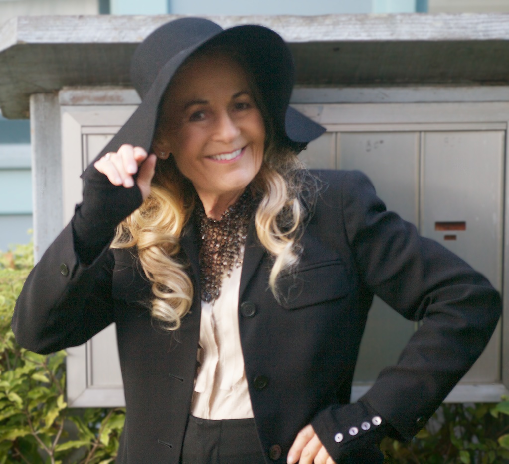 Vertigo black trousers: NYC. Jones of NY black jacket: thrifted. Fabulous Patrick Robinson silk and organza blouse: gifted from cousins Kathy/Danielle. Underneath blouse: silk camisole: LLBean. Mz. Moon black boots: Rabat. Hat: Target. Boho cashmere, fingerless gloves: molly B.