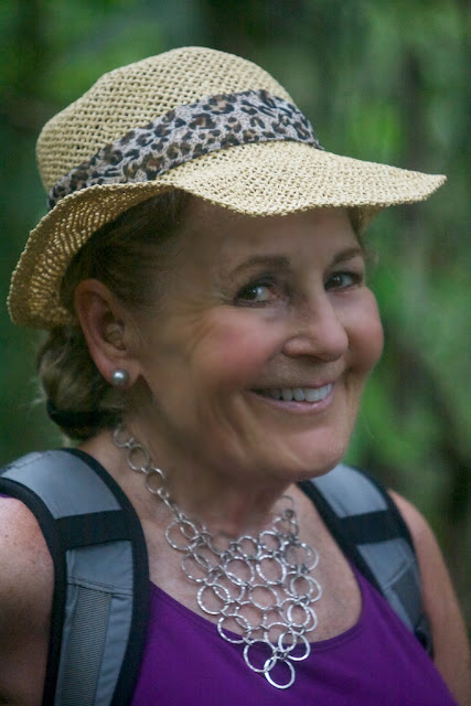 Quepos, at the marina. I wore Jessica's Gap 1969 jean shorts & my maxstudio white linen top, with Champion visor and Keen sandals. I purposely left all my shorts at home, thinking my 70 year old legs not fit for public consumption. But it is too hot & humid for the long pants I did bring.