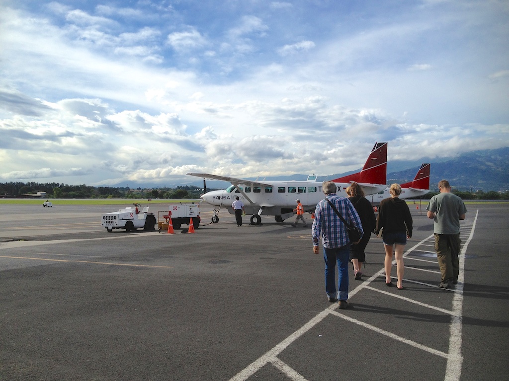8 am I took a Sansa flight in a 12-seat propeller plane, 40 minutes south to Drakes Bay, CR.