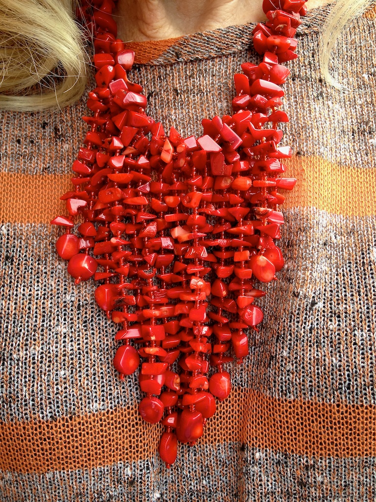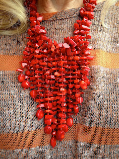 It's officially fall; we had rain today. The rust orange of this outfit is echoed in the fallen leaves and this redwood church. Guest photographer today is Claudia using my iPhone4S. Bee Stitched sweater just arrived gift from Kathy & Danielle. Rust, crocheted fingerless gloves made of bamboo fiber: Bryn Walker (brynwalker.com/). Second hand Etienne Aigner black boots. The creator of the coral weeping bead necklace is my big news. While shooting a wedding at San Francisco Hall on Monday I came across a very creative designer who is a street vendor, Julies Gifts 415.823.6396 (Jain2006@yahoo.com). Being my age and without plastic surgery I look for the cover-up aspect of draping necklaces. Her creations were so exciting I immediately scooped up four of them. The pink & yellow chocker I didn't buy; it isn't my style but it is so gorgeous I had to take a photo to share with you, in case any of you want to buy it.
